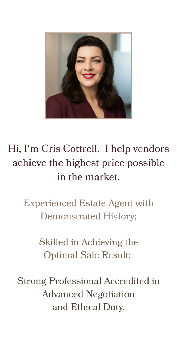 Hi, I‘m Cris Cottrell, and I help vendors get the highest price possible in the market. Your property could be worth $1m or perhaps you have acreage or a luxury property worth several millions therefore it is more important than ever for you to have a skilled agent advocating for you and protecting your final sale price.